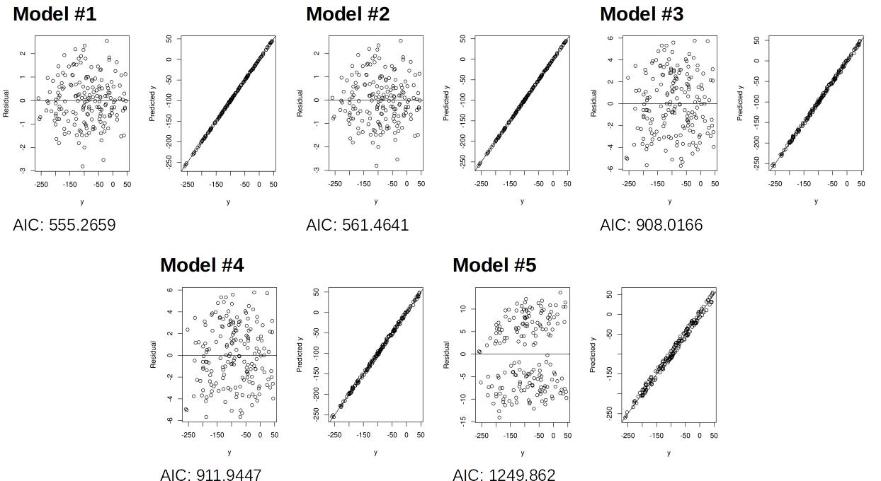 par(mfrow = c(1,2)) plot(y, resid(m1), xlab = 'y', ylab = 'Residual'); abline(0,0) plot(y,predict(m1),ylab = 'Predicted y');abline(0,1) print(AIC(m1)) m2 <- lmer(y ~ (1 + 1 | g) + x1 + (0 + x2 | g)) plot(y, resid(m2), xlab = 'y', ylab = 'Residual'); abline(0,0) plot(y,predict(m2),ylab = 'Predicted y');abline(0,1) print(AIC(m2)) m3 <- lmer(y ~ (1 | g) + x1 + x2) plot(y, resid(m3), xlab = 'y', ylab = 'Residual'); abline(0,0) plot(y,predict(m3),ylab = 'Predicted y');abline(0,1) print(AIC(m3)) m4 <- lmer(y ~ 0 + (1 | g) + x1 + x2) plot(y, resid(m4), xlab = 'y', ylab = 'Residual'); abline(0,0) plot(y,predict(m4),ylab = 'Predicted y');abline(0,1) print(AIC(m4)) m5 <- lm(y ~ x1 + x2) plot(y, resid(m5), xlab = 'y', ylab = 'Residual'); abline(0,0) plot(y,predict(m5),ylab = 'Predicted y');abline(0,1) print(AIC(m5))