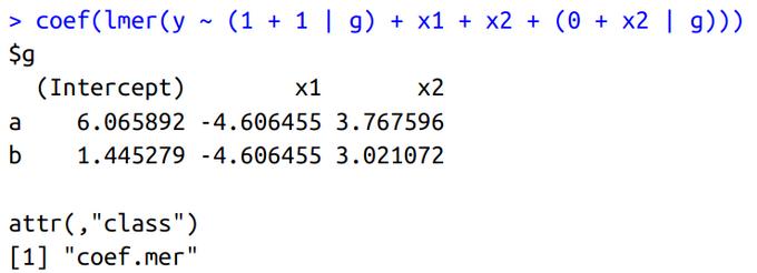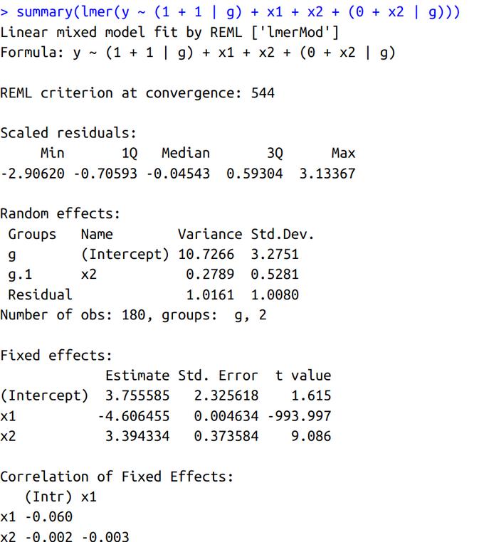 m1 <- lmer(y ~ (1 + 1 | g) + x1 + x2 + (0 + x2 | g))