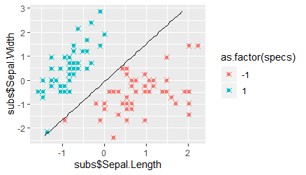 set.seed(9) w1_start = rnorm(1) w2_start = rnorm(1) b_start = rnorm(1) optimz = optimr(c(w1_start, w2_start, b_start), opt_probl) pars = optimz$par dat_preds = sign(pars[1] * subs$Sepal.Length + pars[2] * subs$Sepal.Width + pars[3])
