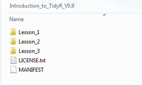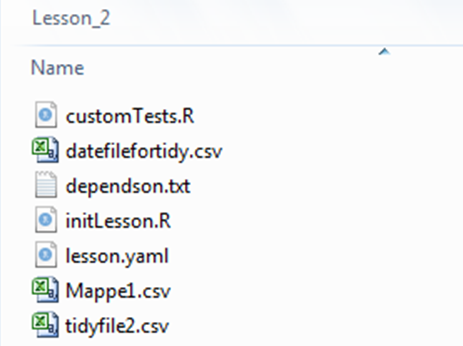Now let us take a look at the initLesson.R file. As stated above, this file is executed before the lesson commences with the first question or message to the user. It thus sets up the R session without the user having to do so in the context of lesson tasks. Typical contents of the initLesson.R script are the optional installation and import of packages, the import and preparation of datasets and the definition of custom functions to be accessed during lesson tasks. Datasets to be imported are typically supplied as part of the zipped course file that is downloaded by the user (unless it is part of the base R package). They are located in the lesson folder that contains the lesson.yaml and initLesson.R scripts; however, the user's working directory may not be set to that folder upon starting a lesson. Therefore, a function is defined in initLesson that determines the path from where datasets are to be imported:
