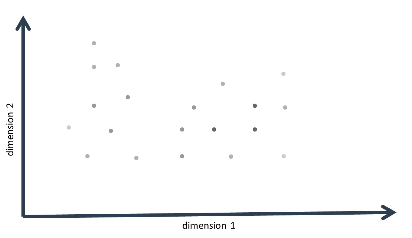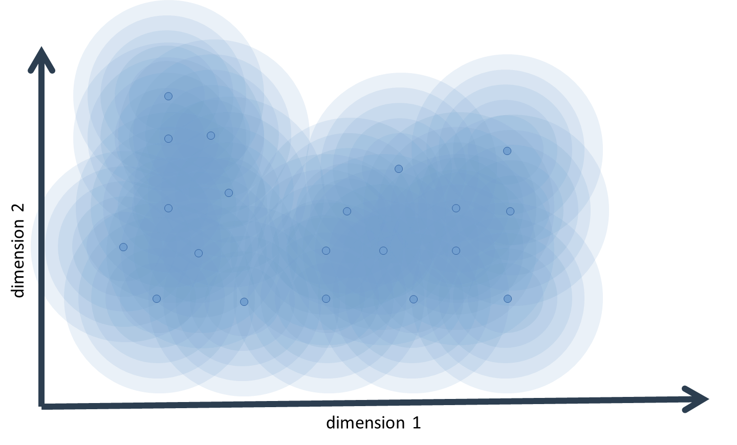The probability-density values obtained for each data-point (the number equals the total number of data-points minus one) are then summed up. When plotting these so-called kernel-density estimates as a color index on the multivariate data, it becomes obvious that data-points that lie in a large neighborhood of data-points have a large kernel-density estimate, while points that lie more separated from the rest have a low kernel-density estimate. A kernel, in this sense, is then a center of gravity around which data-points cluster.