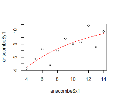 preds = 11.7772005 * (1 - exp(-0.1205108 * sort(anscombe$x1))) plot(anscombe$x1, anscombe$y1); lines(sort(anscombe$x1), preds, col = 'red')