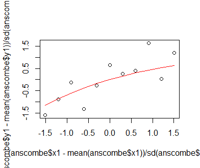 lines(sort((anscombe$x1 - mean(anscombe$x1)) / sd(anscombe$x1)),